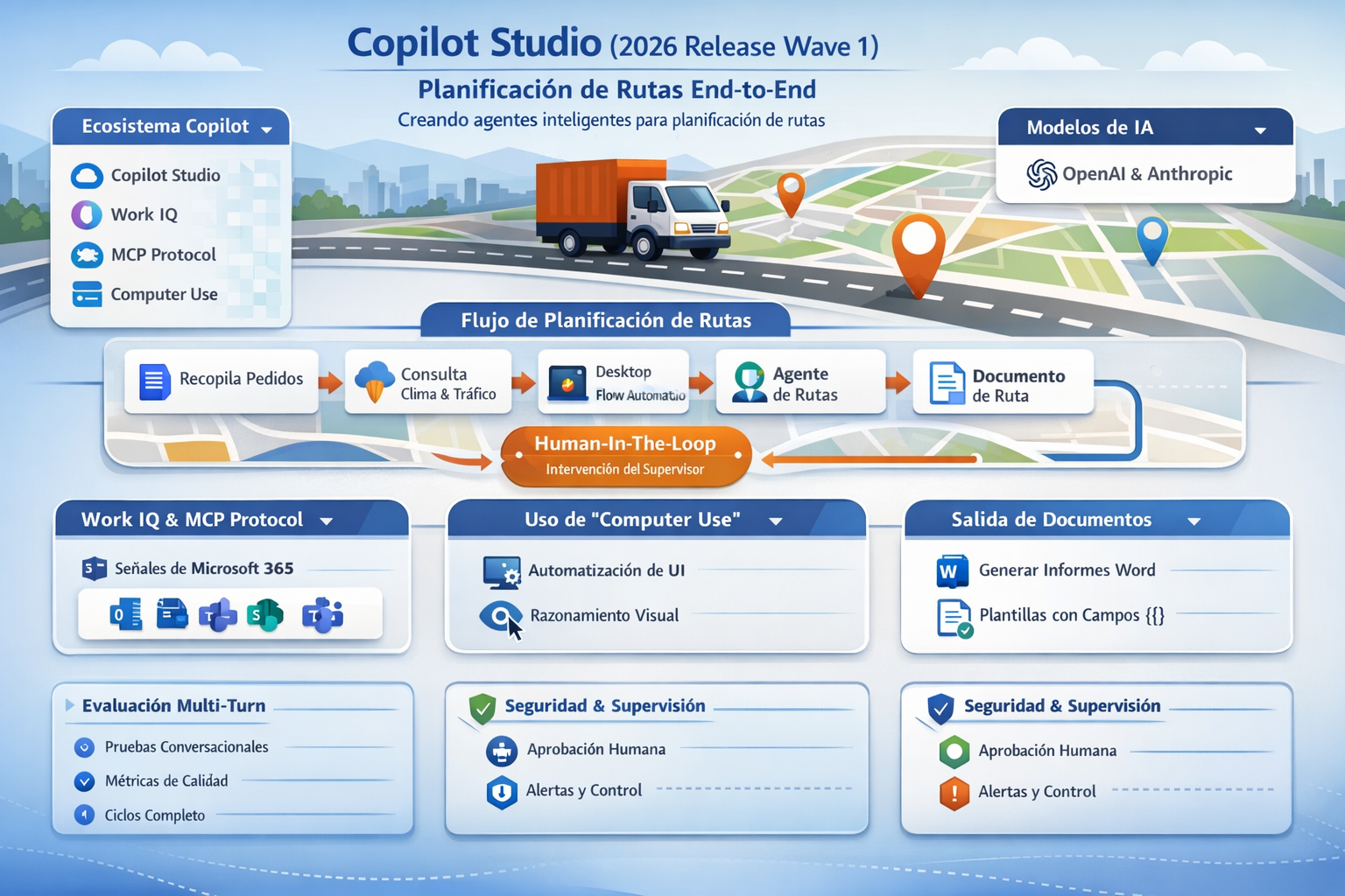 - Mostrar cómo construir una solución de planificación de rutas end‑to‑end usando Copilot Studio y su ecosistema (MCP, Work IQ, Computer use, Power Automate). [learn.microsoft.com], [learn.microsoft.com]