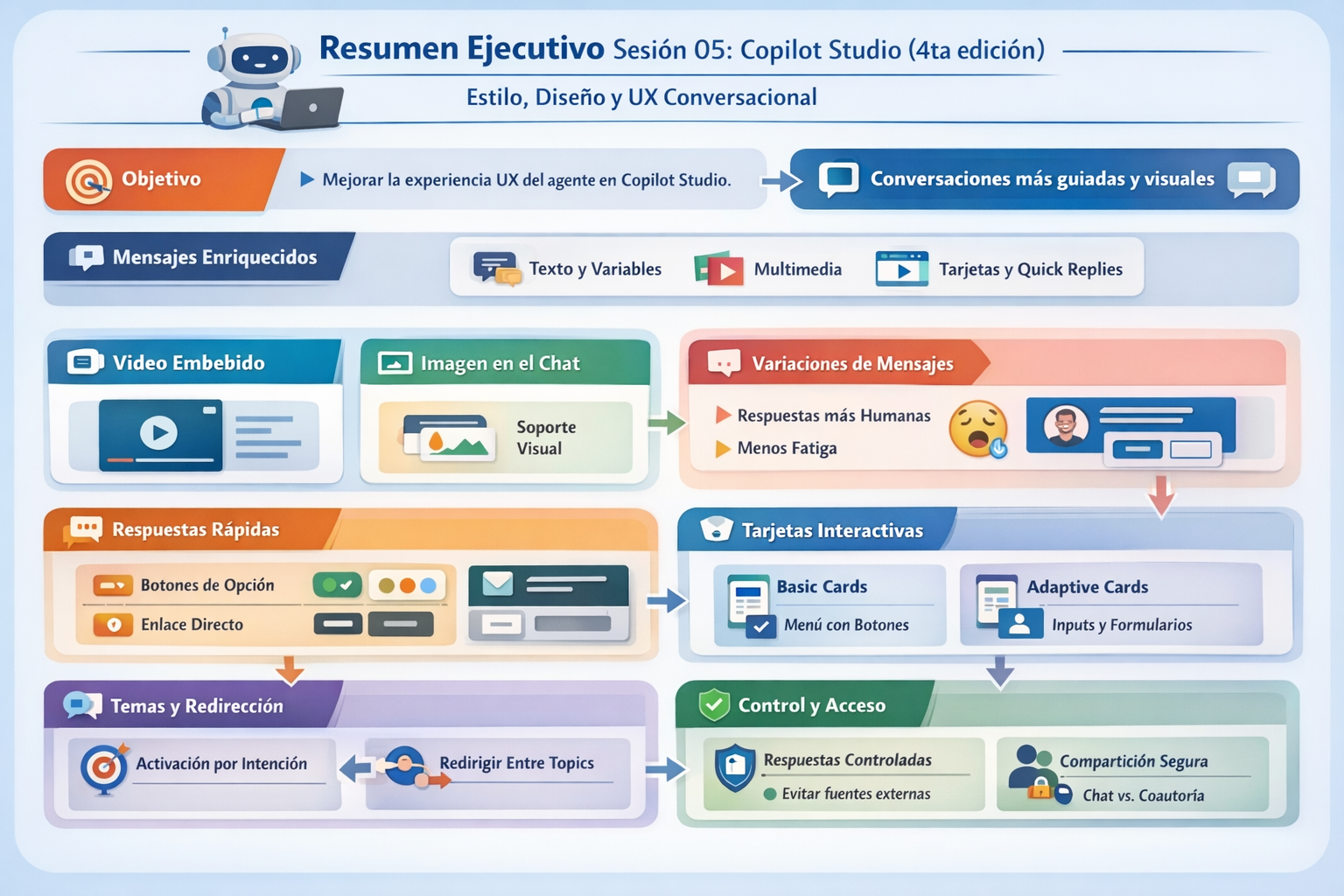 Fortalecer la experiencia de usuario (UX) del agente en Copilot Studio, pasando de respuestas “solo texto” a una conversación más guiada, visual y usable, incorporando: mensajes enriquecidos, multimedia, variaciones de mensajes, respuestas rápidas, tarjetas básicas, tarjetas adaptables (Adaptive Cards) y un repaso práctico de privacidad / compartición / acceso. [learn.microsoft.com], [learn.microsoft.com], [learn.microsoft.com]