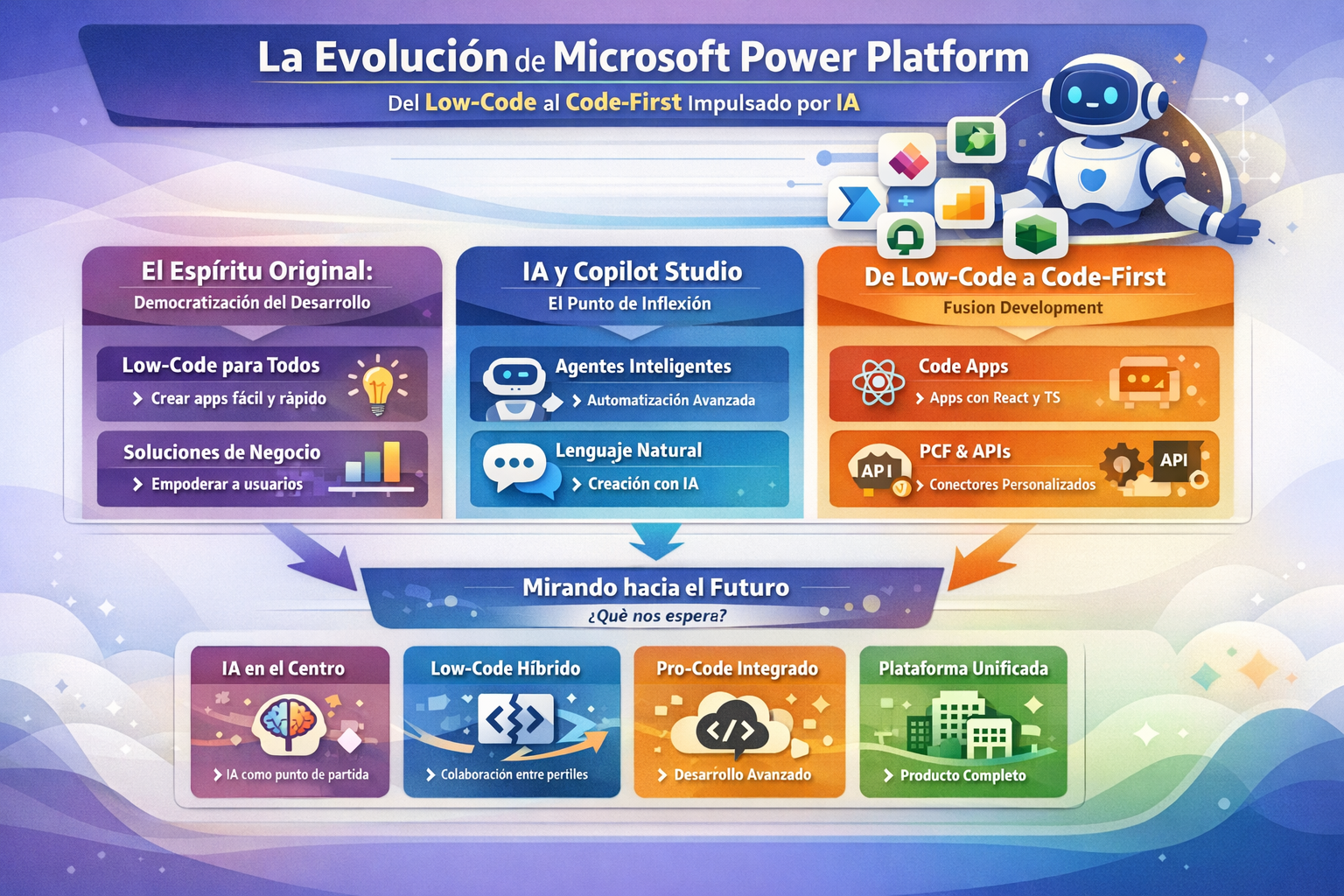 La Microsoft Power Platform está atravesando una de las transformaciones más profundas desde su creación. Para quienes la conocemos desde sus inicios, el cambio es evidente: la plataforma ya no se limita a ser una herramienta low-code pensada exclusivamente para “desarrolladores ciudadanos”, sino que se está convirtiendo en un ecosistema híbrido donde low-code, pro-code e inteligencia artificial conviven de forma nativa.