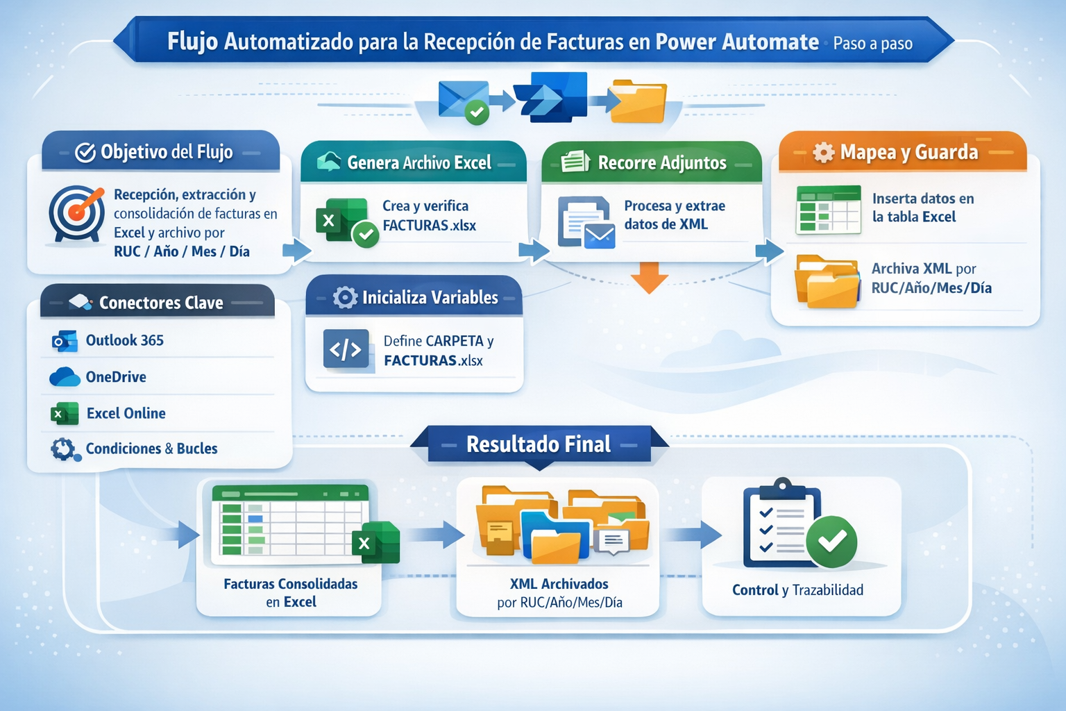 Este flujo de Power Automate Cloud automatiza la recepción de facturas por correo, procesa adjuntos XML, extrae datos clave de la factura, consolida la información en un Excel y organiza los archivos en una estructura de carpetas por RUC / Año / Mes / Día. ✅